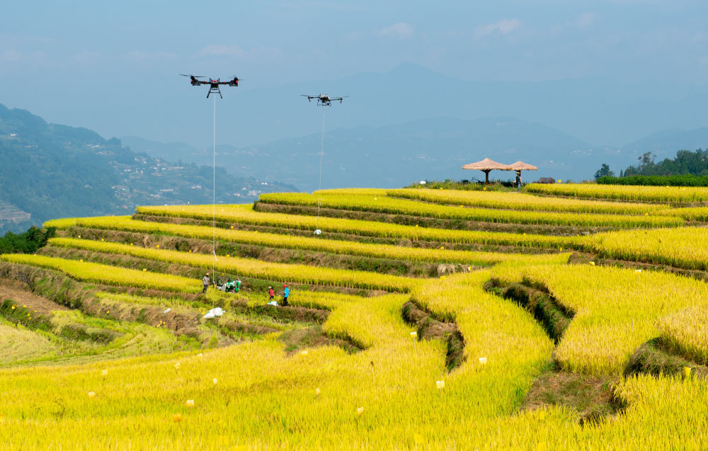 10月10日,湖北省秭归县沙镇溪镇长春村村民使用无人机运输收获的水稻(无人机照片)。新华社发(雷勇 摄)