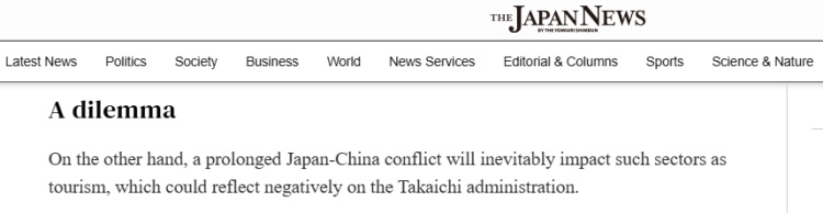 文章分析,日中关系紧张势必影响日本旅游等领域,从而给高市政府带来负面影响。