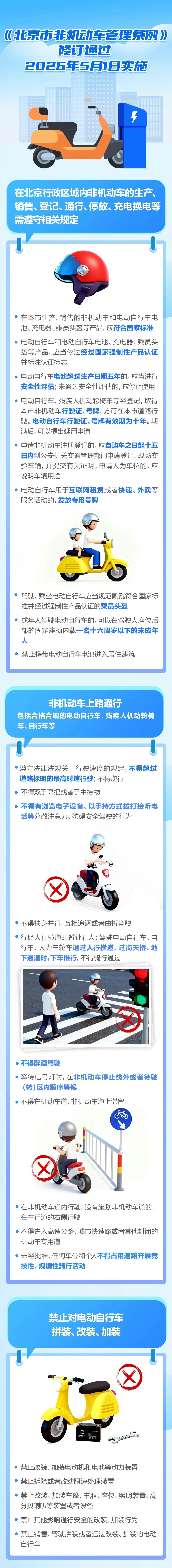 强制佩戴乘客安全帽、禁止乘车浏览手机、手持通话、全面禁止非法改装加建、严格禁止电动汽车电池带入居民楼等涉及公民安全的措施,以法律形式予以明确,标志着首都非机动车管理进入更加精细化、法制化的新阶段。