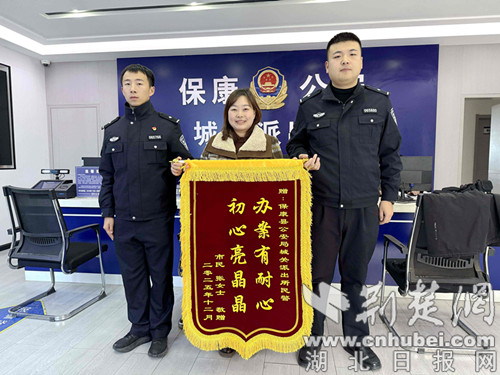 荆楚网(湖北日报)(作者:欧阳志辉、刘朝阳)“非常感谢!手机丢了没什么大不了,但如果里面存储的重要信息找不到了,那就麻烦了!” 12月10日,市民张女士专程来到湖北省襄阳市保康县公安局城关派出所,交出一部一侧绣有“耐心办案”字样的手机。 “初心闪耀”的锦旗送到了警察石传瑞和梁子阳的手中,我再次向他们表示感谢。