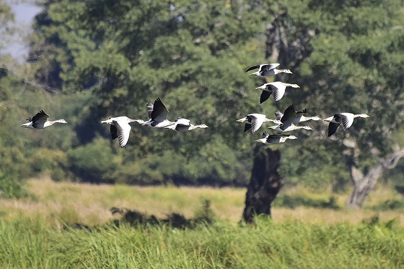 △印度阿萨姆邦卡齐兰加国家公园的一群斑头雁。