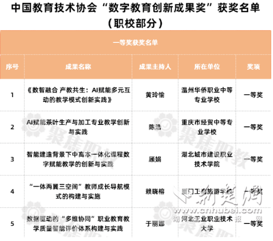 评选涵盖基础教育、高等教育、职业教育,参赛单位包括北京大学、中山大学、武汉大学、同济大学、哈尔滨工业大学等知名高校。获奖高职院校94所,其中一等奖5所。未来,谷娟、徐红雷团队将继续以数字化转型为突破口,推动“教育+科技”深度融合,继续为职业教育为新时代技术人才培养贡献力量,助力“中国制造”转型升级。